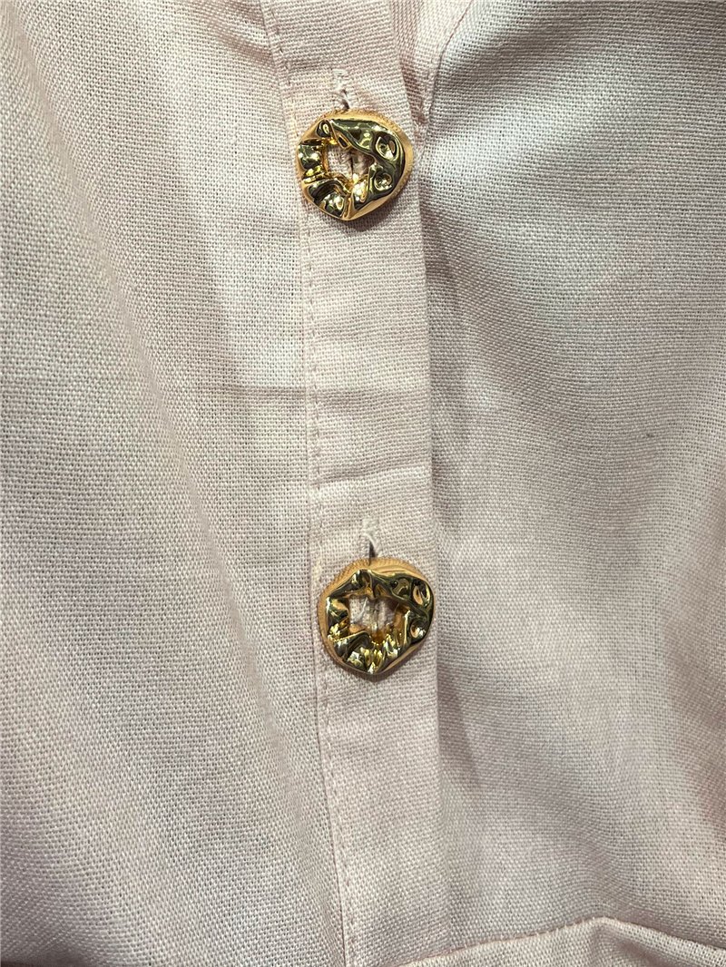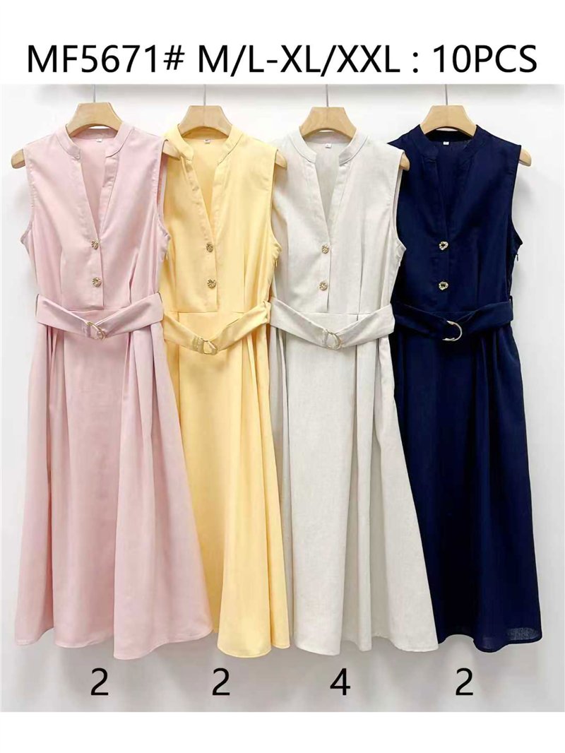 Vestido midi sem mangas. Tecido com efeito linho. Decote em V. Detalhe de cinto. Saia plissada. Fecho frontal com botões.