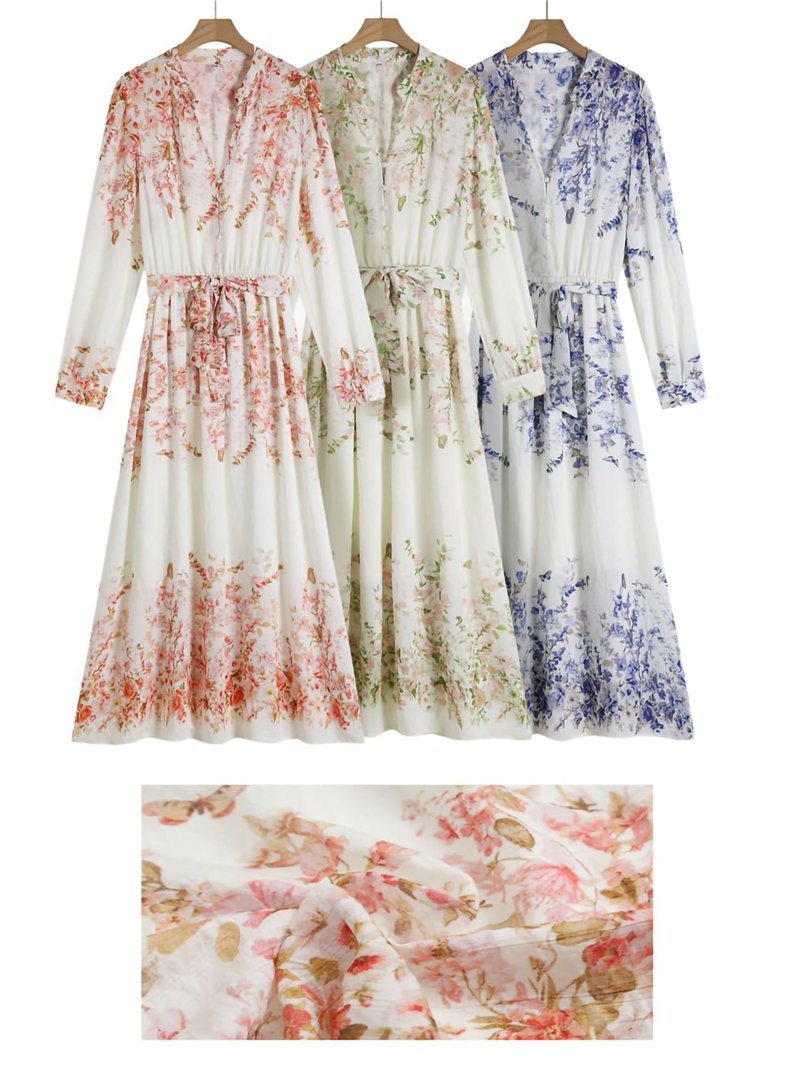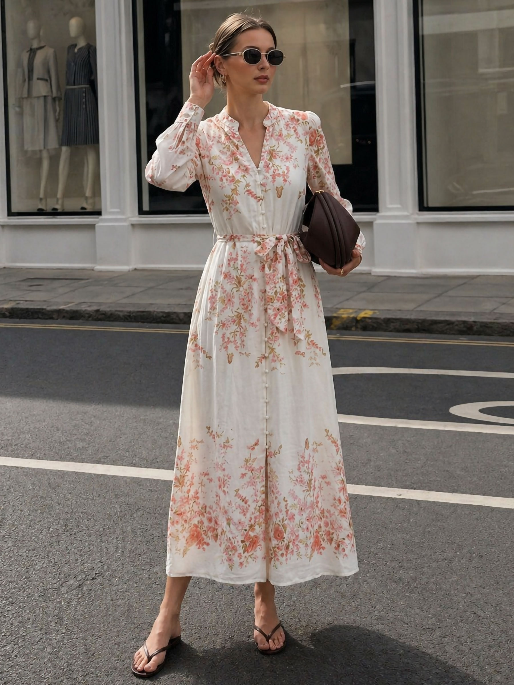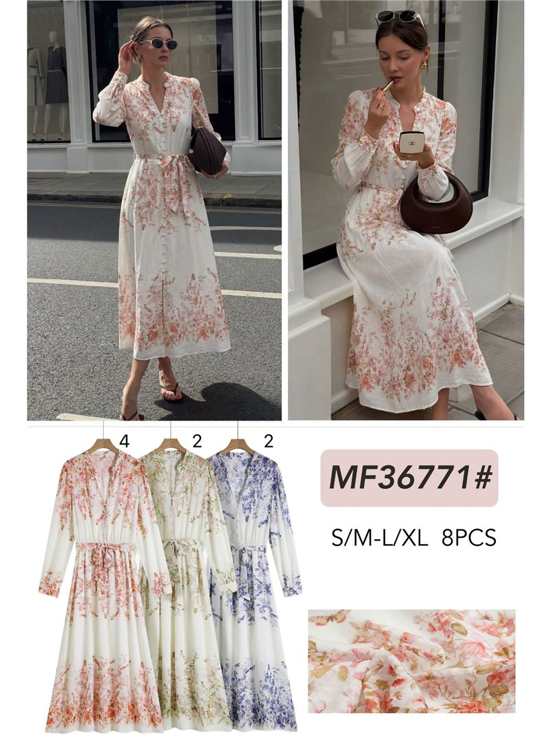 Vestido longo floral com efeito linho e cinto.