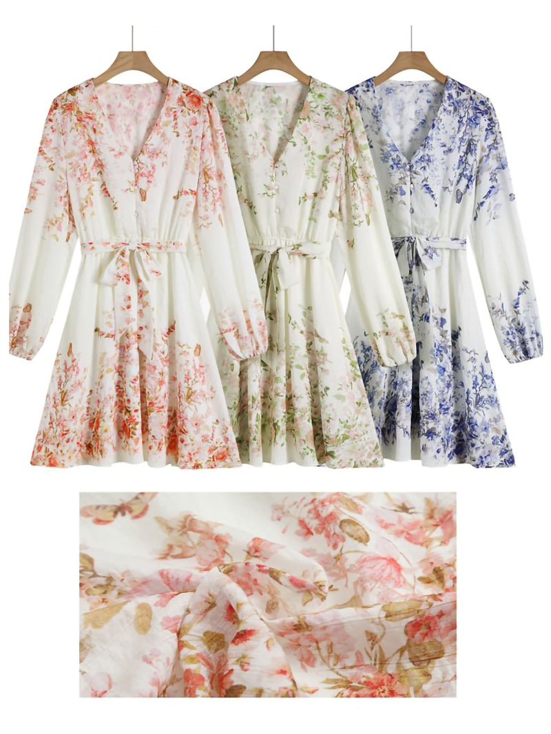Vestido curto com estampa floral. Decote em V. Tecido com efeito linho. Mangas compridas. Cinto do mesmo tecido. Fechamento frontal com botões.
